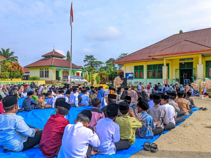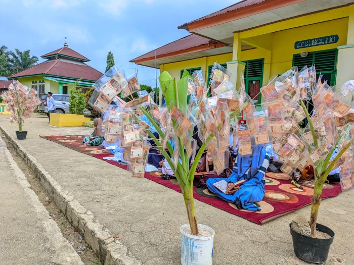 Rimbo Bujang (MIN 4 TEBO) - Perayaan Maulid Nabi Muhammad SAW di MIN 4 Tebo tahun ini kembali menghadirkan tradisi unik yang dikenal sebagai "Pohon Berkah". Pohon tersebut berupa batang pisang yang dihiasi lembaran uang kertas, hasil infaq dari para guru. Adapun jumlah yang disediakan sebanyak tiga batang pisang dengan total 240 lembar uang pecahan Rp5.000 untuk dibagikan kepada seluruh siswa. Tradisi ini sudah berjalan sejak 2023, dan setiap tahun menjadi momen yang ditunggu oleh siswa.