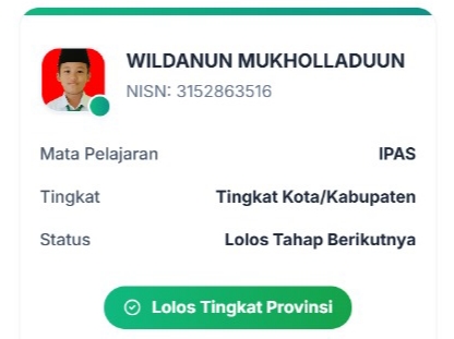 Rimbo Bujang (MIN 4 TEBO) – Wildanun Mukholladuun, siswa Kelas 5B MIN 4 Tebo, berhasil melaju ke Olimpiade Madrasah Indonesia (OMI) 2025 tingkat Provinsi Jambi. Ia terpilih menjadi salah satu dari tiga wakil Kabupaten Tebo setelah lolos seleksi tingkat kabupaten yang berlangsung pada 10 September lalu.