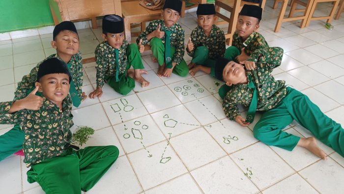 Aktivitas belajar semakin meriah ketika beberapa kelompok sempat salah menempatkan blok dan harus mengulang penyusunan bentuk bangun datar. Dinamika kelompok yang kompetitif namun sehat tercipta alami saat siswa berdiskusi menentukan letak dan bentuk yang tepat. Semangat kolaborasi tampak jelas ketika anggota kelompok saling membantu menyusun daun membentuk berbagai bangun datar sesuai instruksi cerita.