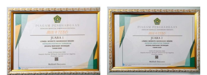 Sedangkan penghargaan Juara 2 untuk kategori "Kreativitas Terbaik" mengindikasikan bahwa website MIN 4 Tebo tidak hanya aktif, tetapi juga dikelola dengan pendekatan yang inovatif, menarik, dan mudah diakses oleh masyarakat. Hal ini mencerminkan komitmen madrasah untuk menyajikan informasi pendidikan dengan cara yang segar dan relevan.