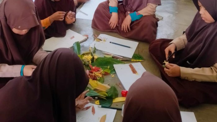 Proses penempelan daun dan bunga membutuhkan ketelitian dan kesabaran. Siswa dengan cermat memilih bahan yang sesuai, mengatur komposisi warna, dan menempelkannya dengan lem secara hati-hati. Kegiatan ini melatih motorik halus, kejelian visual, serta kemampuan mengapresiasi tekstur dan warna dari benda-benda di alam.
