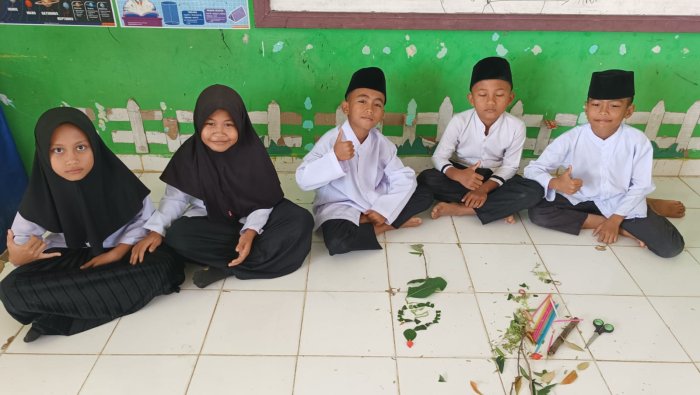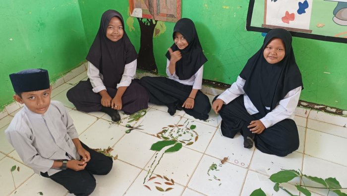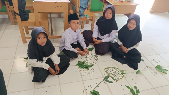 Setelah pemaparan konsep, siswa dibagi ke dalam empat kelompok dan diberikan tantangan langsung, membuat model atau alat peraga organ pencernaan menggunakan berbagai benda yang bisa ditemukan di sekitar madrasah atau dalam kelas. Bahan-bahan yang digunakan beragam, mulai dari dedaunan, potongan kertas warna-warni, sedotan (pipet), hingga alat tulis, yang digelar di lantai kelas.