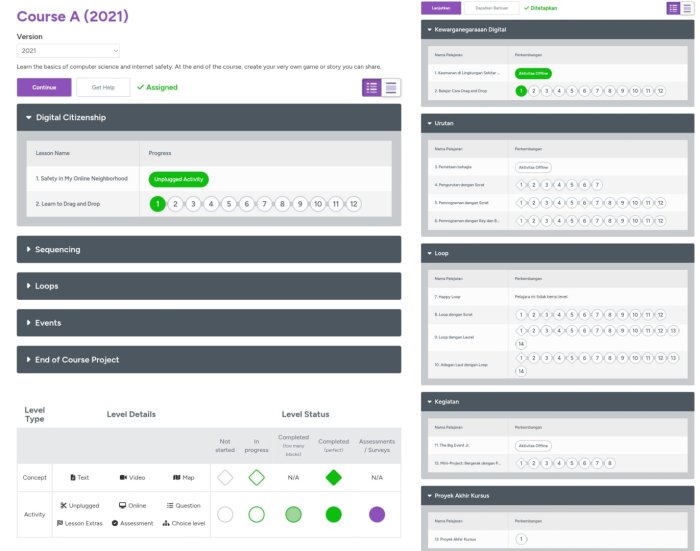 Materi Course A dirancang dengan alur yang sistematis. Pembelajaran dimulai dengan Kewarganegaraan Digital (Digital Citizenship) untuk membekali siswa tentang keamanan berinternet. Kemudian, siswa akan dikenalkan pada konsep dasar pemrograman seperti Urutan (Sequencing) untuk menyusun instruksi, Loop (Pengulangan) untuk membuat kode lebih efisien, dan Kegiatan (Events) yang mengajarkan bagaimana sebuah aksi memicu perintah dalam program.