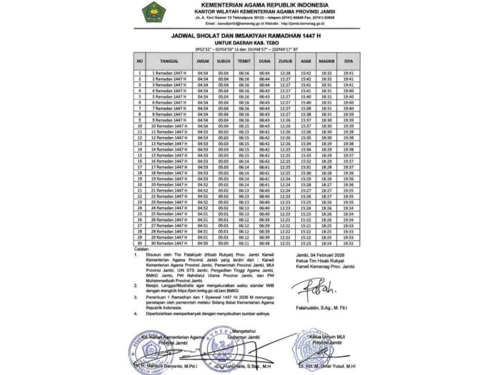 Dengan adanya jadwal imsakiyah resmi ini, diharapkan seluruh siswa dan keluarga besar MIN 4 Tebo dapat menjalani ibadah puasa dengan lebih khusyuk dan teratur, memanfaatkan setiap momen Ramadhan dengan sebaik-baiknya.