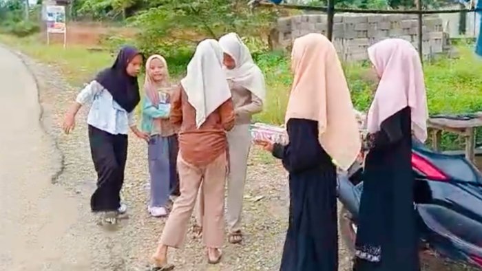 Rimbo Bujang (MIN 4 Tebo) - Mendung mulai menggantung sekitar pukul 17.15, mengancam akan turun hujan. Namun, hal itu tidak menyurutkan semangat beberapa guru dan siswa kelas 6 perempuan MIN 4 Tebo untuk segera turun ke jalan. Dengan sigap, mereka membawa lebih dari 200 paket takjil ke simpang jalan Sepaku, Desa Jaya Mulya, untuk dibagikan kepada masyarakat yang melintas. Kurang dari 30 menit, semua paket habis dibagikan.