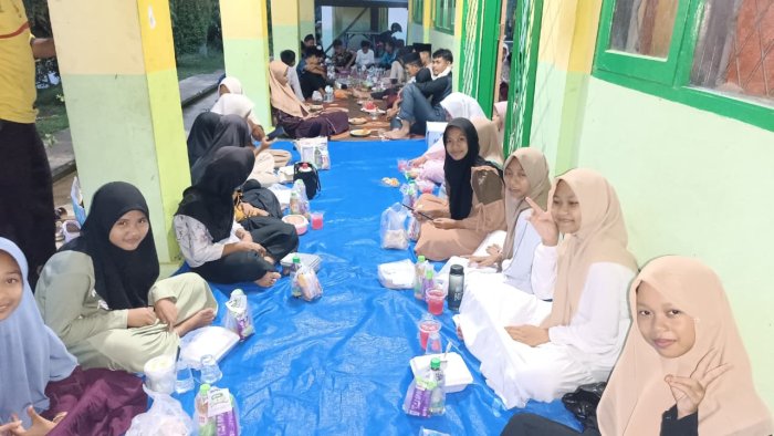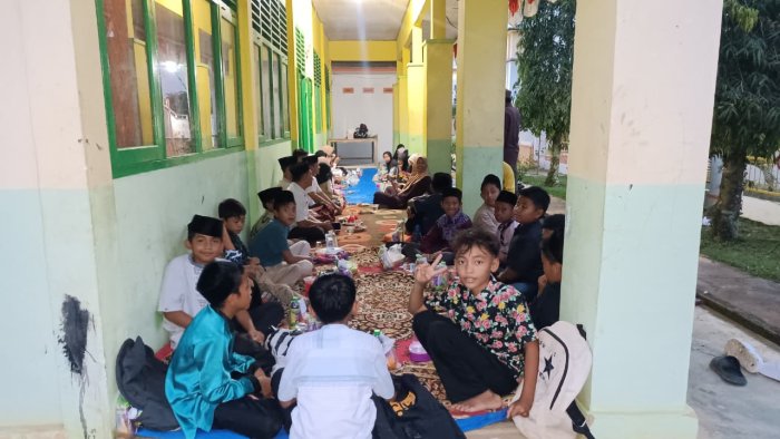 Rimbo Bujang (MIN 4 Tebo) - Menjelang waktu berbuka, suasana hangat terasa di lingkungan MIN 4 Tebo. Setelah khataman dan pembagian takjil, para guru beserta anggota keluarga berkumpul untuk berbuka puasa bersama. Ibu-ibu sibuk menyiapkan menu berbuka, sementara yang lain bercengkrama mempererat silaturahmi. Hujan yang turun cukup deras setelah azan magrib justru menambah kekhusyukan suasana.