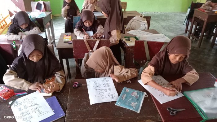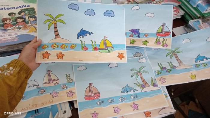Guru memberikan kebebasan penuh bagi siswa untuk berkreasi sesuai imajinasi masing-masing tanpa adanya batasan kaku. Hasilnya, karya setiap anak menjadi sangat unik; ada yang menempatkan perahu sedang berlayar di laut, ada pula yang menempatkan perahu sedang berlabuh dengan, begitu pula dengan pohon kelapa, ada yang menempatkan di bibir pantai, ada pula yang memilih meletakkan di tengah laut membentuk seperti pulau kecil. Kebebasan ini membuat siswa merasa lebih percaya diri dalam mengekspresikan ide-ide kreatifnya di atas kertas.