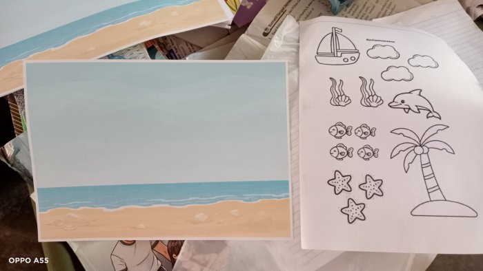 Setiap siswa mendapatkan dua lembar kertas kerja sebagai bahan utama. Lembar pertama merupakan gambar latar pemandangan tepi pantai yang masih polos, sedangkan lembar kedua berisi aneka gambar kecil seperti perahu, pohon kelapa, awan, ikan-ikan kecil, lumba-lumba, bintang laut dan rumput laut. Sebelum ditempel, siswa terlebih dahulu harus memberikan warna pada gambar-gambar kecil tersebut agar tampilan kolase nantinya menjadi lebih hidup dan menarik.
