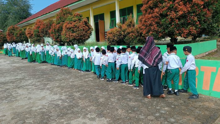 Setelah sambutan, tibalah momen puncak: saling bersalaman. Untuk memastikan semua siswa mendapat giliran, guru mengatur siswa membentuk barisan melingkar membentuk huruf O. Urutannya dimulai dari kelas 1 yang saling menyalami teman di sebelahnya, lalu mengular menyambung ke kelas 2, 3, 4, 5, 6, hingga para guru dan tenaga kependidikan. Proses ini berlangsung tertib, dengan siswa bergerak perlahan mengikuti arahan guru.