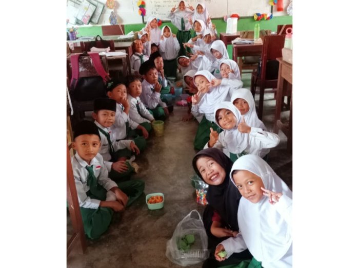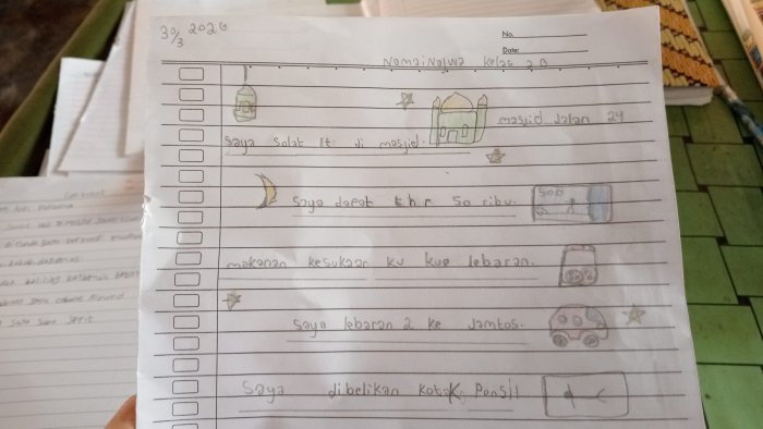 Yang menarik, beberapa siswa tidak hanya menulis cerita, tetapi juga menyertakan gambar. Ada yang menggambar masjid tempat ia shalat Id, ada yang menggambar uang THR, ada pula yang menggambar mobil sebagai ekspresi jalan-jalan ke mall. Ekspresi kebahagiaan terpancar dari setiap coretan mereka. Guru berkeliling melihat hasil karya anak-anak, sesekali memberikan pujian.
