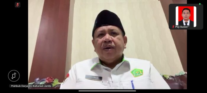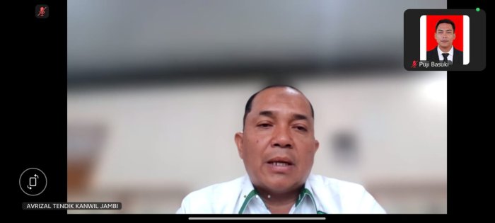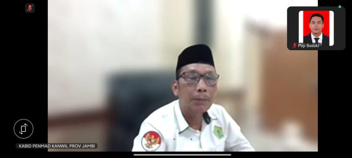 Zoom meeting dimulai pukul 08.00 WIB dan diikuti oleh Kepala Seksi Pendidikan Madrasah se-Provinsi Jambi, Kepala Madrasah Negeri (MIN, MTsN, MAN), serta operator. Para peserta mengikuti dari satuan kerja masing-masing.