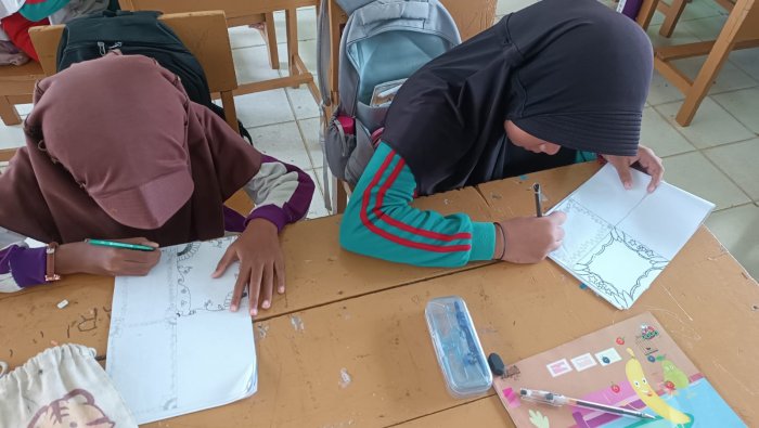 Perlahan-lahan, siswa mulai menemukan ritme mereka. Ada yang menggambar pola dengan daun yang simetris mengikuti alur bingkai. Ada yang membuat sulur-sulur yang meliuk-liuk. Ada pula yang menggabungkan bunga dan daun dalam satu komposisi yang harmonis. Beberapa siswa yang lebih percaya diri mulai bereksperimen dengan variasi bentuk. Guru terus memberikan semangat dan koreksi ringan. “Bagus, ini sudah mulai terlihat. Sekarang tambahin sedikit detail di sini,” katanya sambil menunjuk bagian gambar yang masih kosong.
